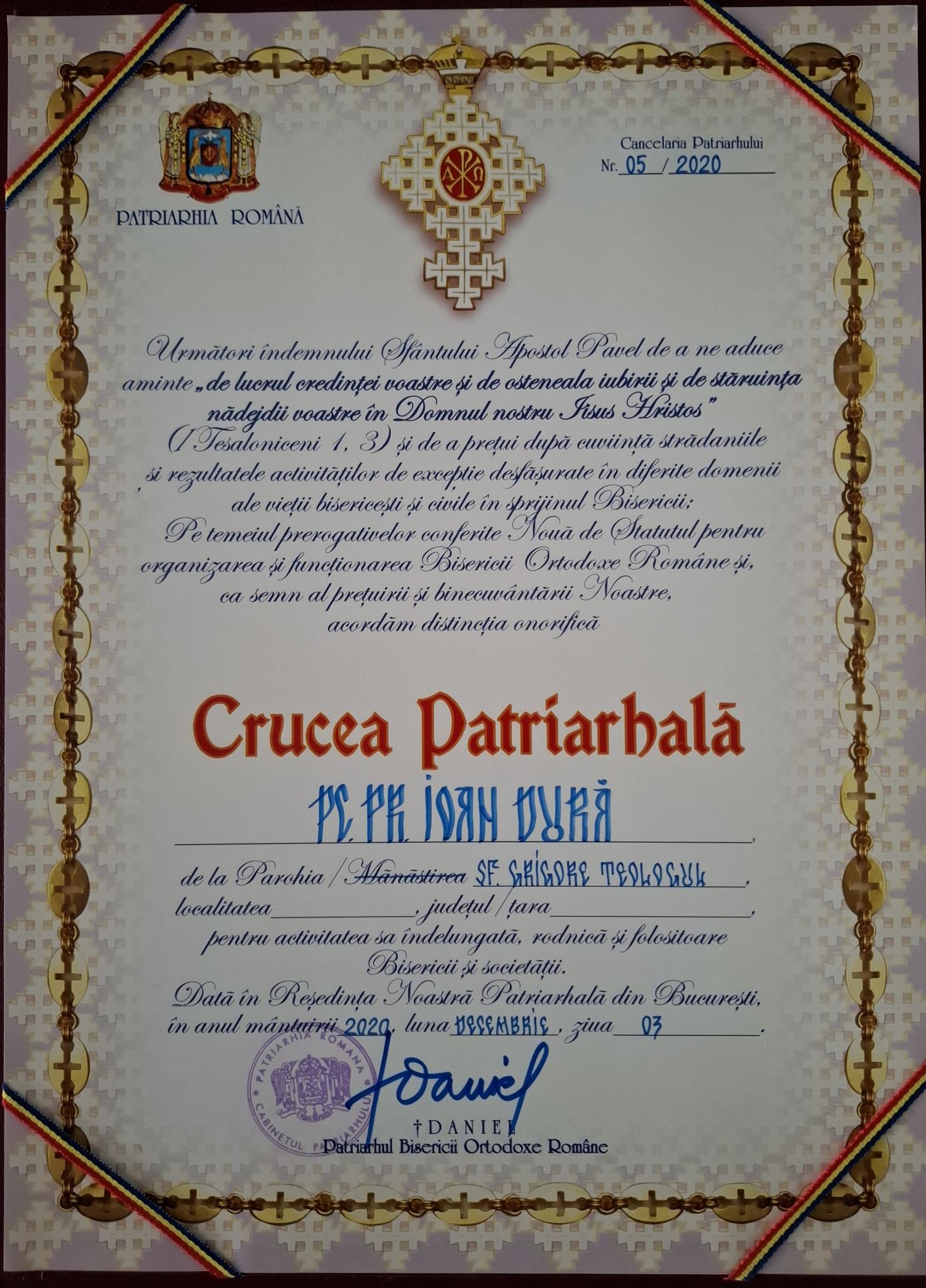Ultima legitimație de protopop al Protoieriei Olandei și Belgiei flamande am primit-o din partea Î. P. S. Mitropolit Iosif în ianuarie 2016 și are valabilitate pe trei ani: 2016-2018. (A se vedea, rubrica, "Constituirea Protopopiatului și numirea Protopopului".) Crucea PatriarhalăLa 3 decembrie 2020, Părintele Patriarh DANIEL Patriarhul Bsericii Ortodoxe Române a acordat Preotului Ioan Dură, CRUCEA PATRIARHALĂ "pentru activitatea sa îndelungată, rodnică și folositoare Bisericii și societății".
